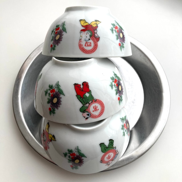 童子が抱える「四」「季」「常」「春」の文字。 シキトコハル、一年中気候が春のようである=転じて、四季を通じて常に花がある理想郷のことを意味するようです。 この童子のモチーフは香港好きの方ならスタンダードで響くのではないでしょうか? ただしこの製品は比較的近年に作られたもので、高台に記載があるようにMICROWAVE SAFE=電子レンジ対応モデル。 全体に作りも大らかなので、どちらかと言うとキッチュチャイナの部類でご紹介です。 プリント品質も大らかで、写真「常」のように文字の一部が掠れたり、欠けているものも混在しています。 プリント部分が若干平らにデコボコしていることをご理解のうえお買い求めください。 ※販売単位は1個から/背景の敷物やレンゲは付属しません 直径11cm×高さ5.5cm 原産地:広東省(中国)、仕入元:ペナン(マレーシア) ¥1,000+税