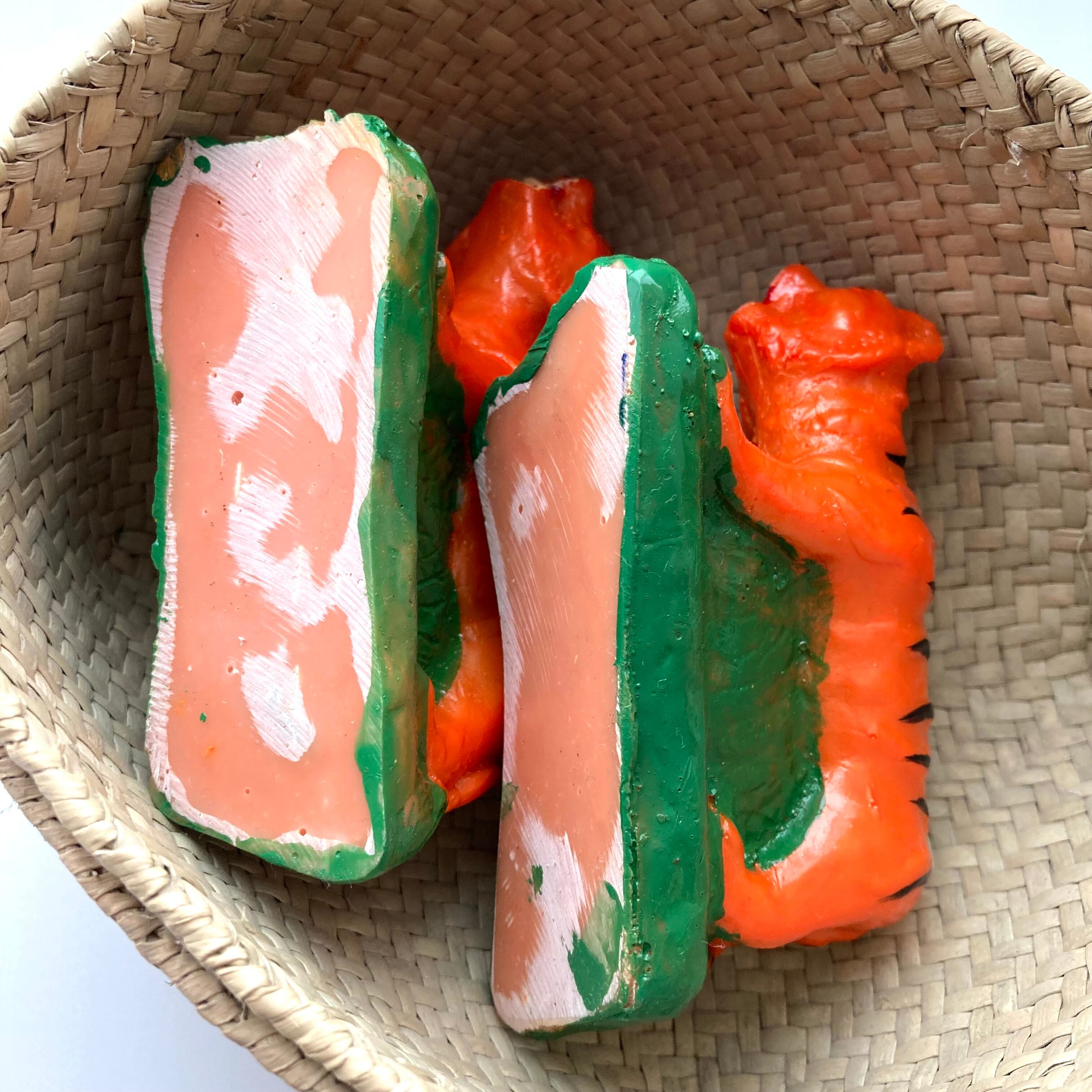 以前「虎のお供え人形」をご紹介しましたが、こちらも同じくタイのピー信仰(精霊信仰)に由来する土地の精霊を祀る祠(サーン・プラプーム)へのお供物です。