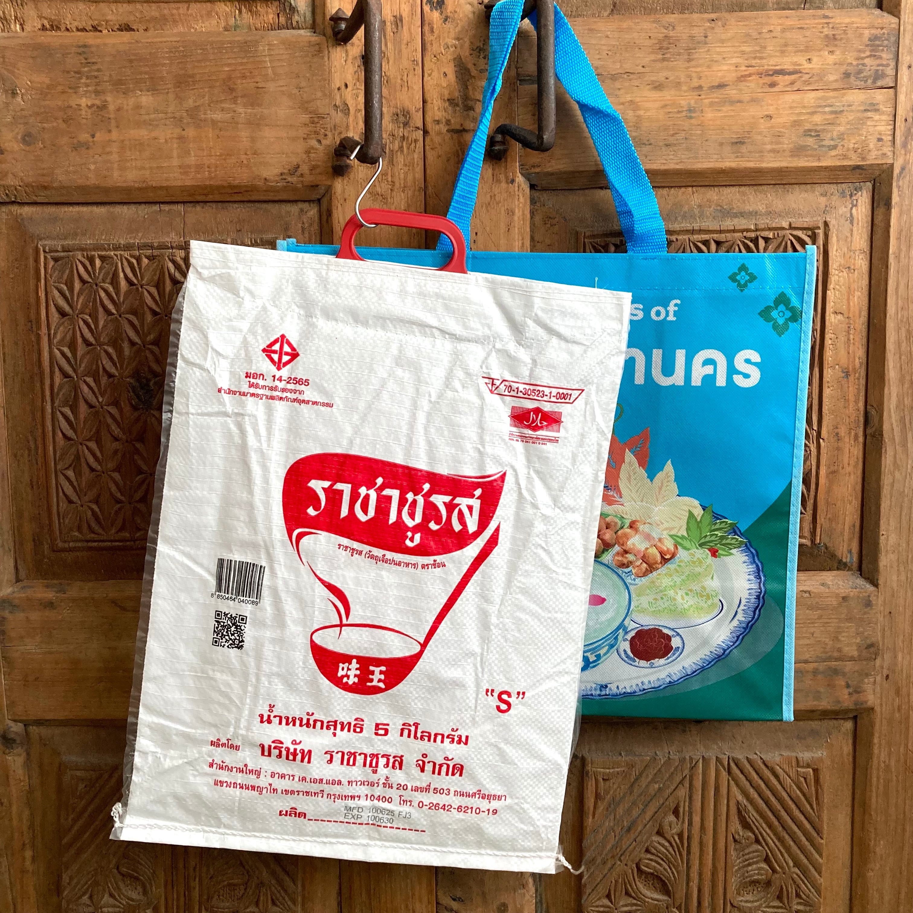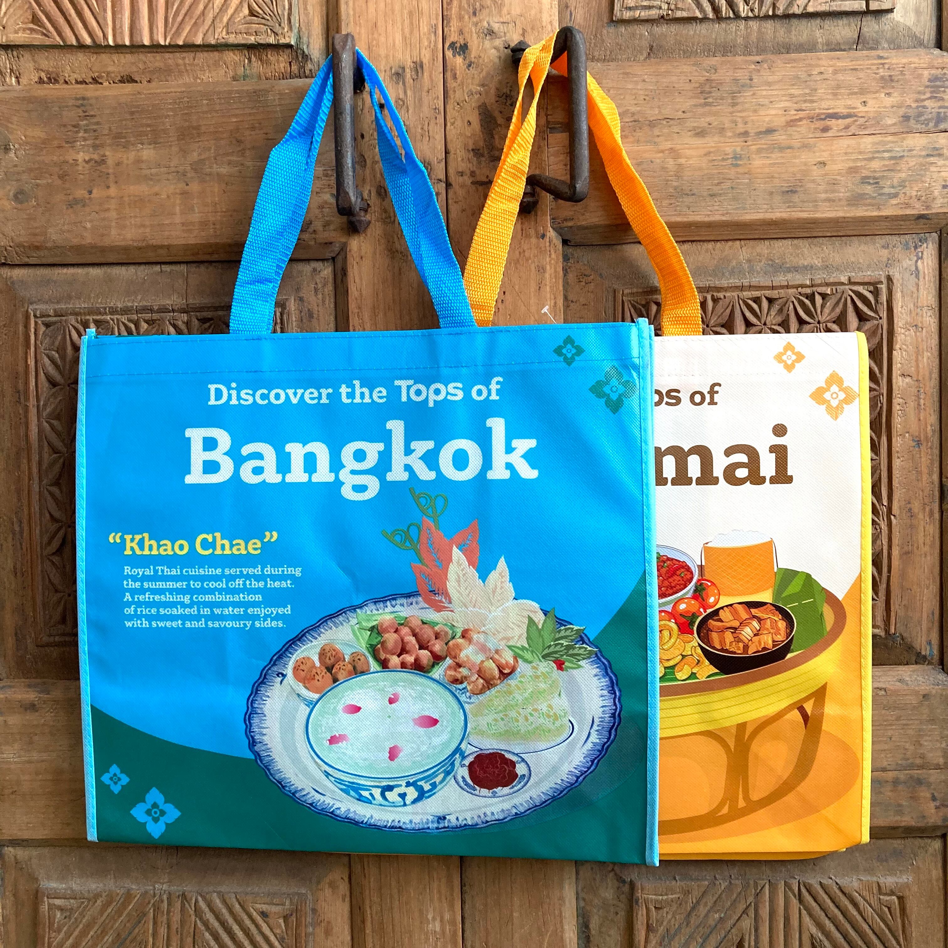 ブルーのショッパーは「กรุงเทพมหานคร」(バンコク)の最高のものを発見しよう」というタイトルで、タイの宮廷料理「ข้าวแช่」(カオチェー)を紹介したもの。