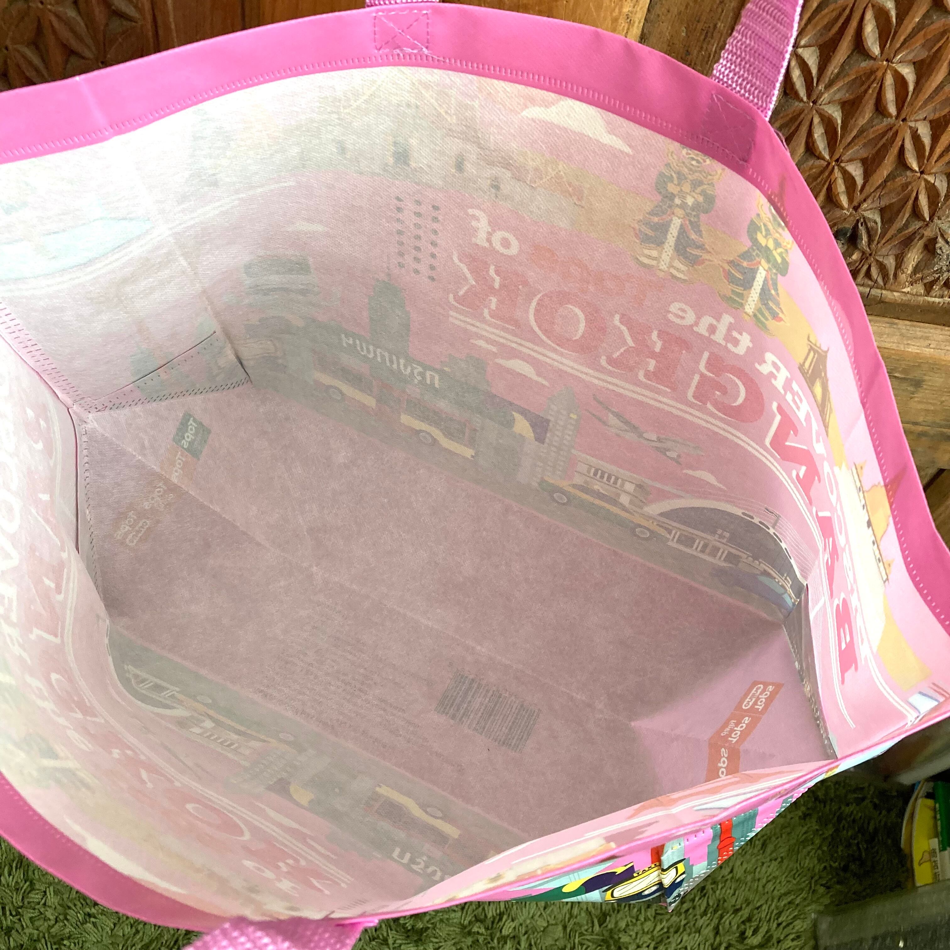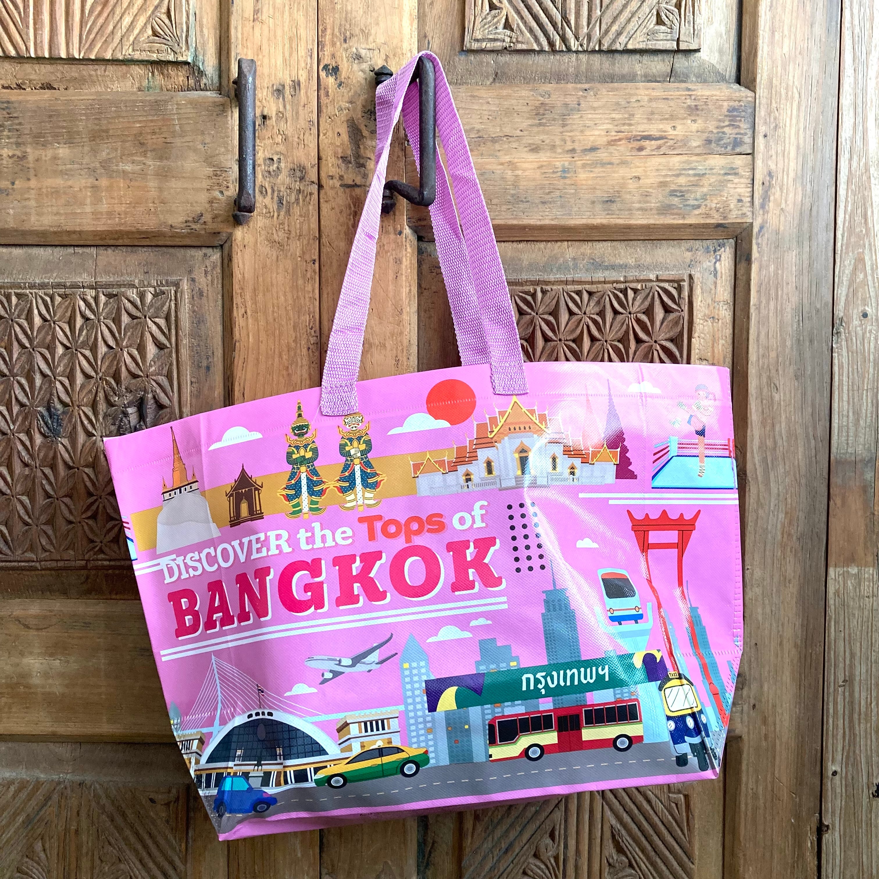 トゥクトゥクやBTS、赤バスや2トーンの個人タクシーなど、ピンク色の背景とともに街中の元気が出るモチーフがたくさん描かれています。
