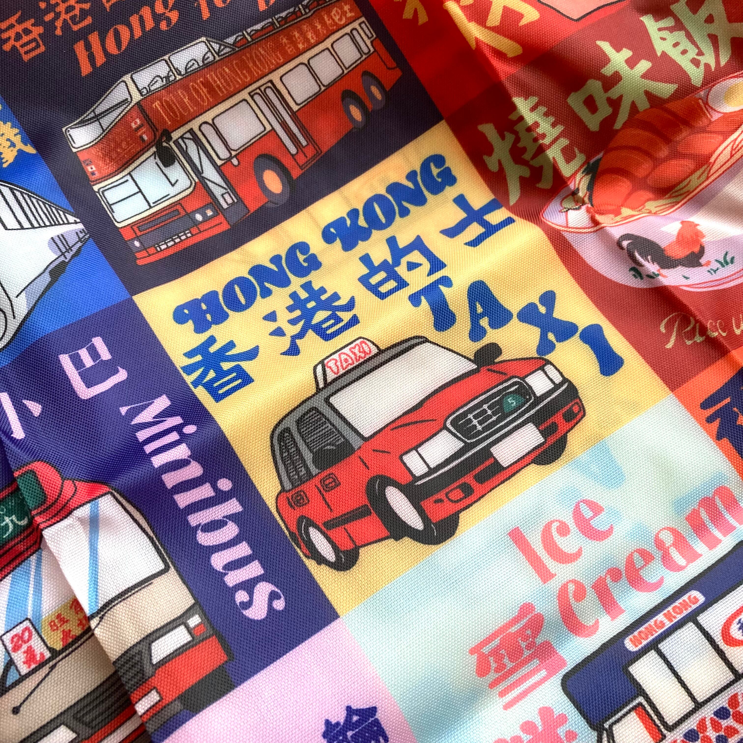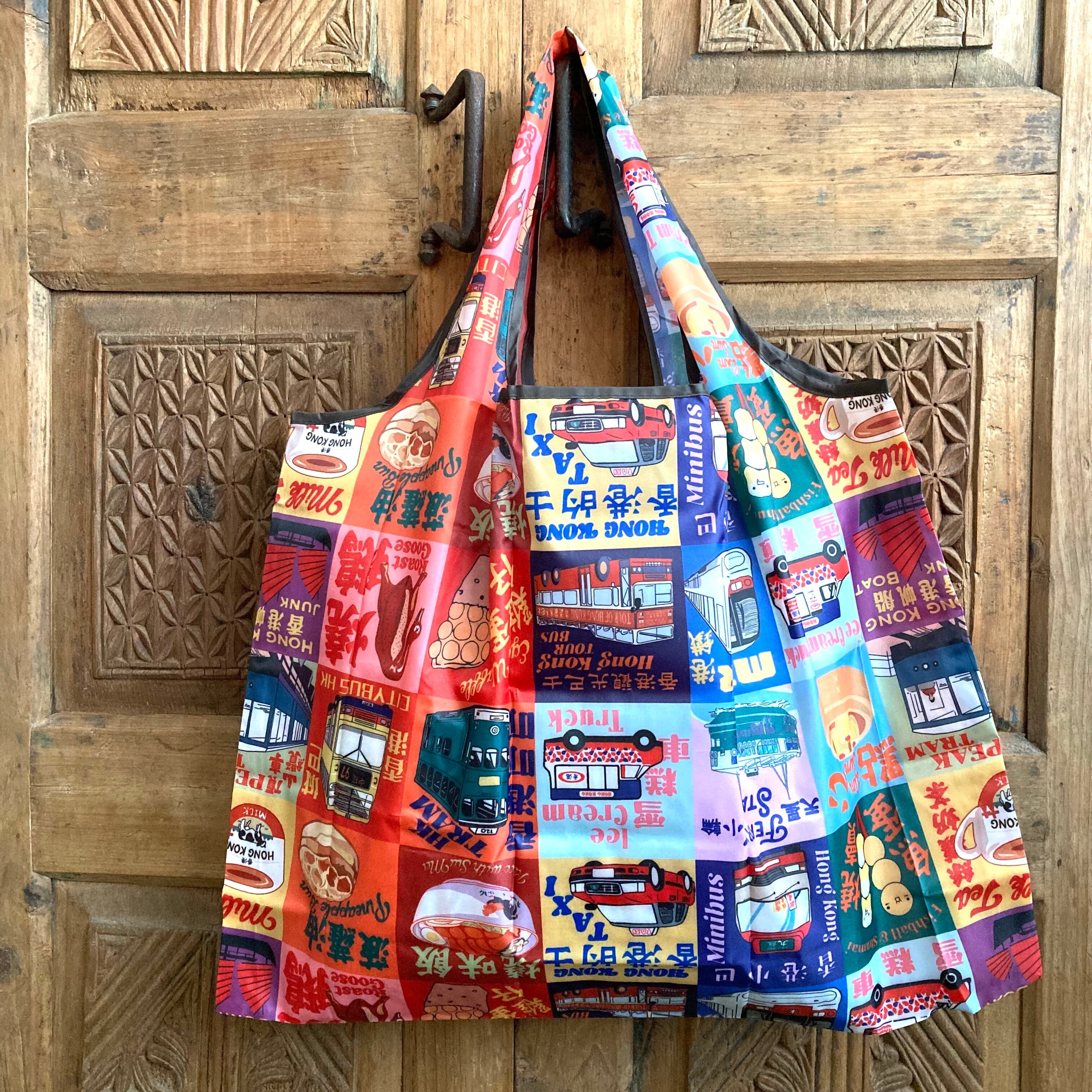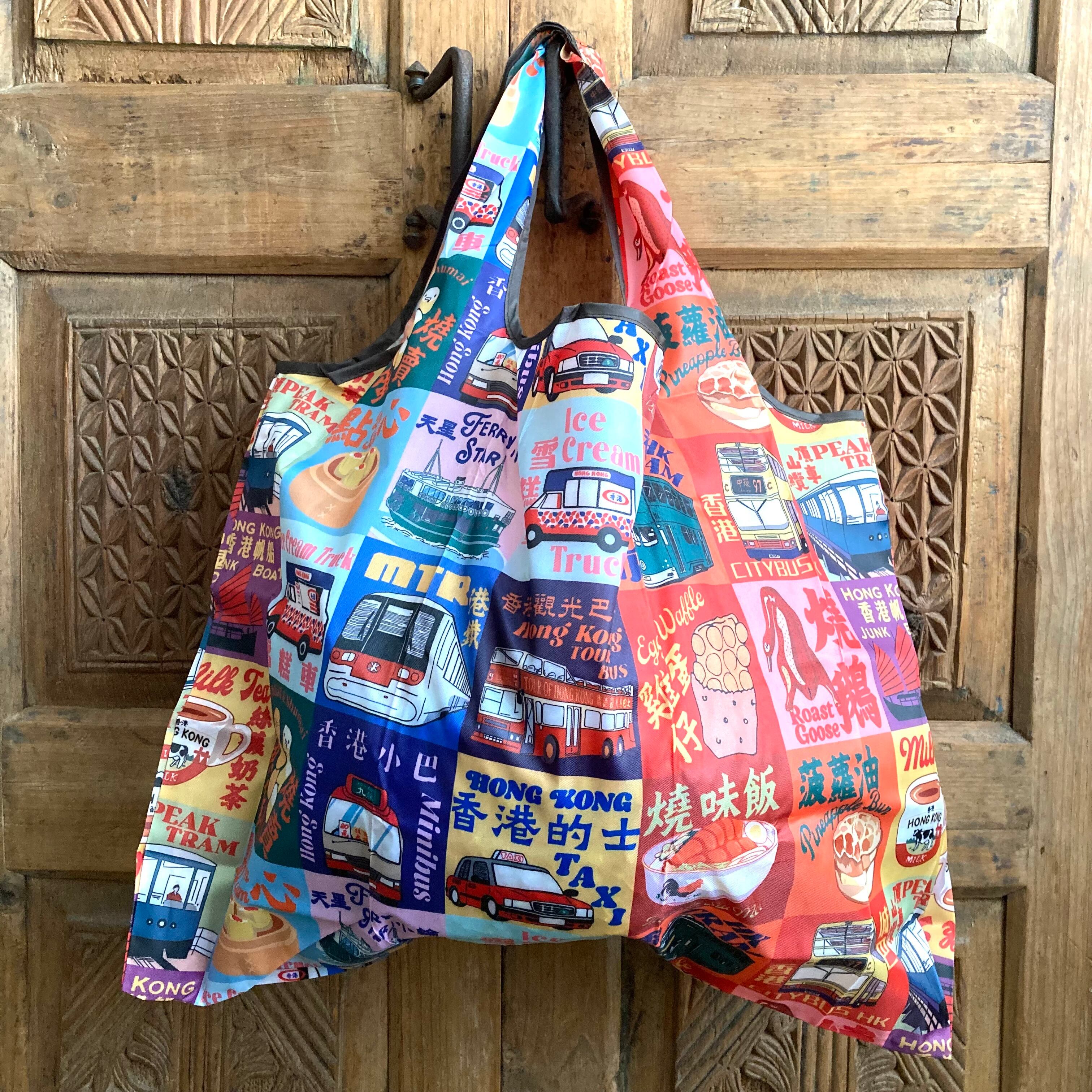 心ときめく色とりどりの香港モチーフが散りばめられプリントされた大型エコトート。