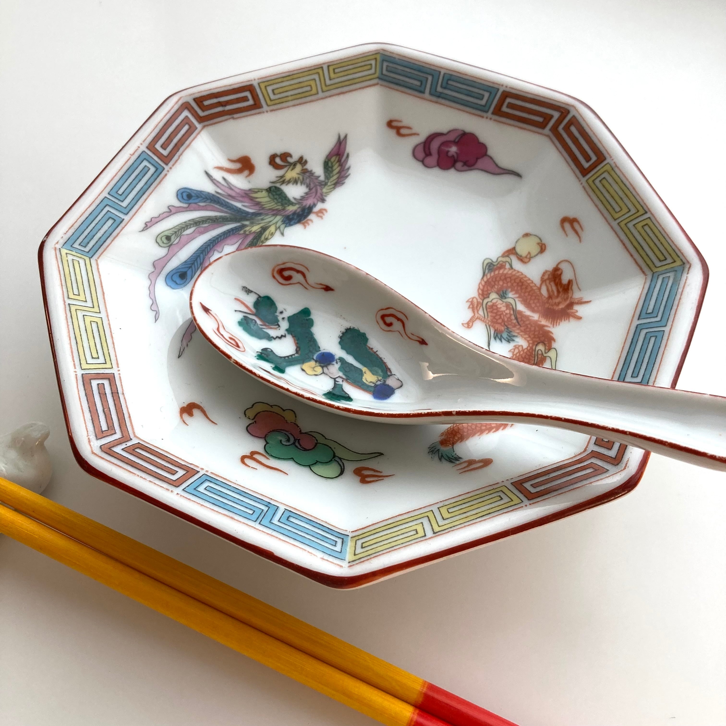 こちらの八角皿は定番的な柄の組み合わせのもの(龍と鳳凰×周りに雷紋、高台に波模様、裏には「山林特製」の銘)ですが、半チャーハンサイズなので小ぶりです。