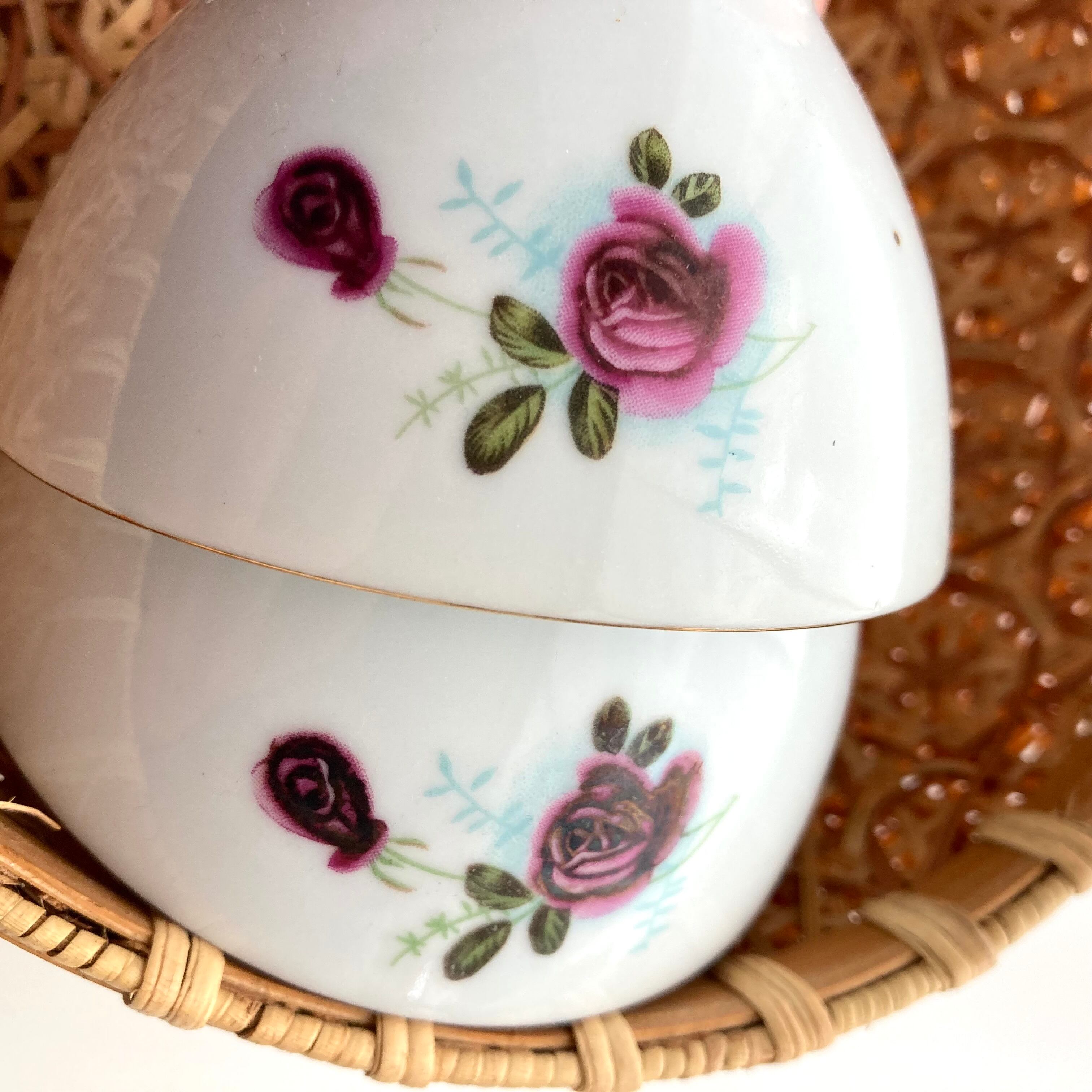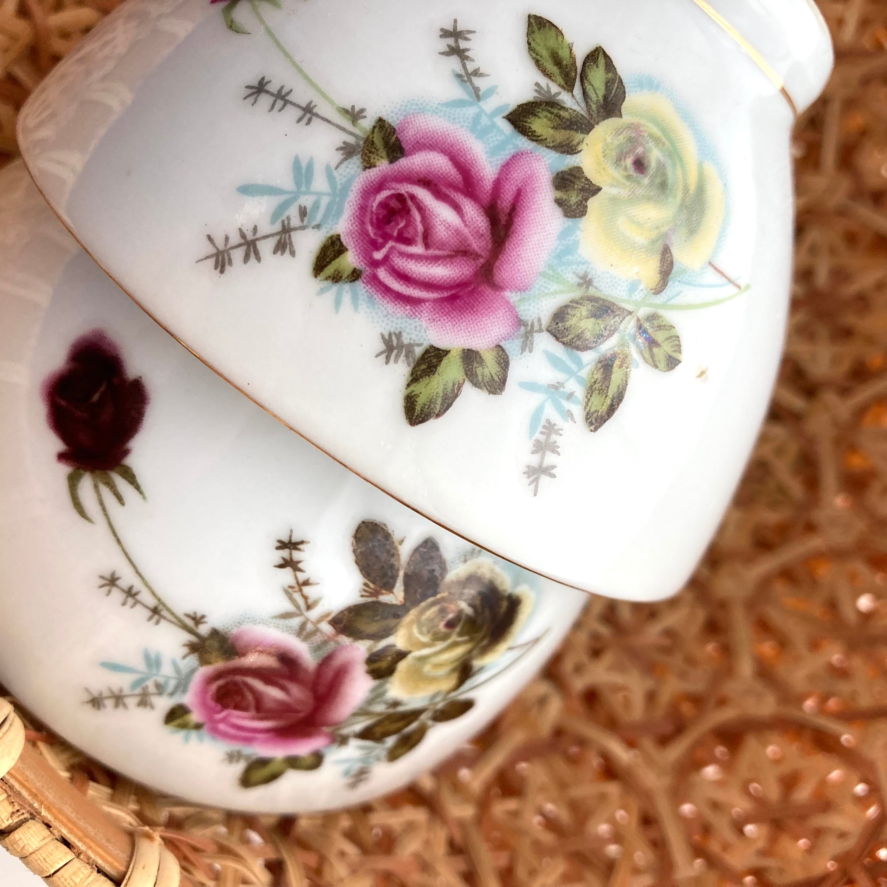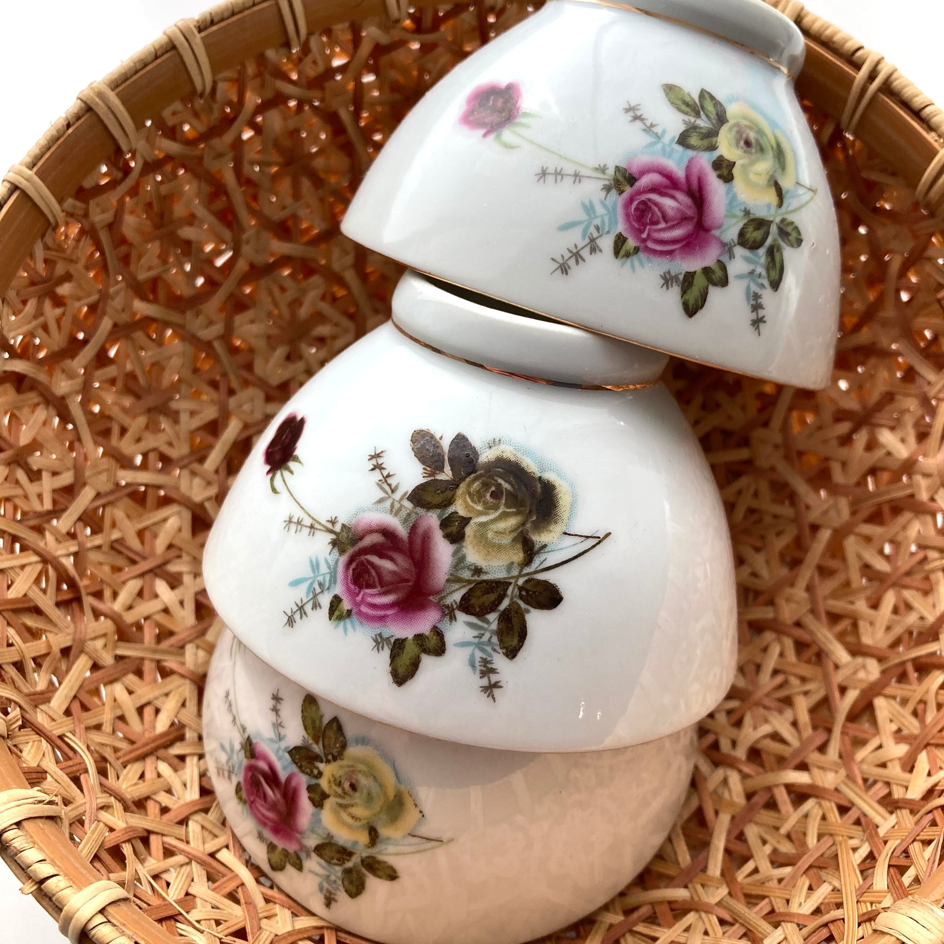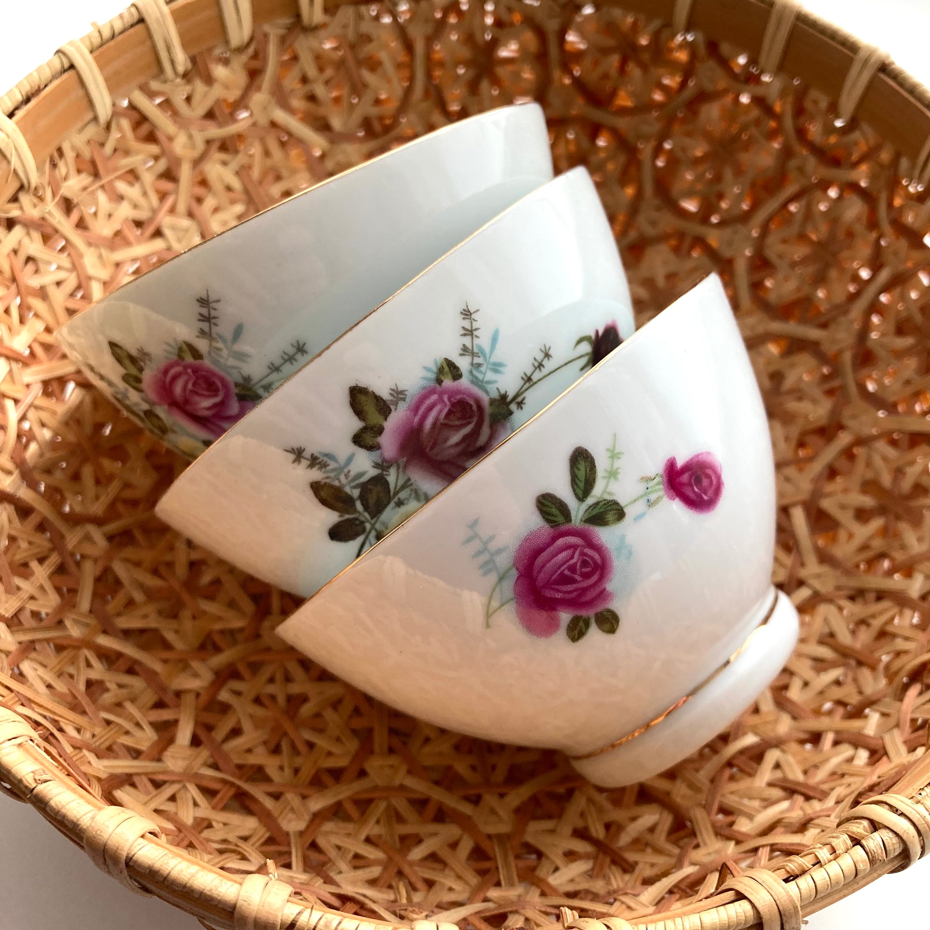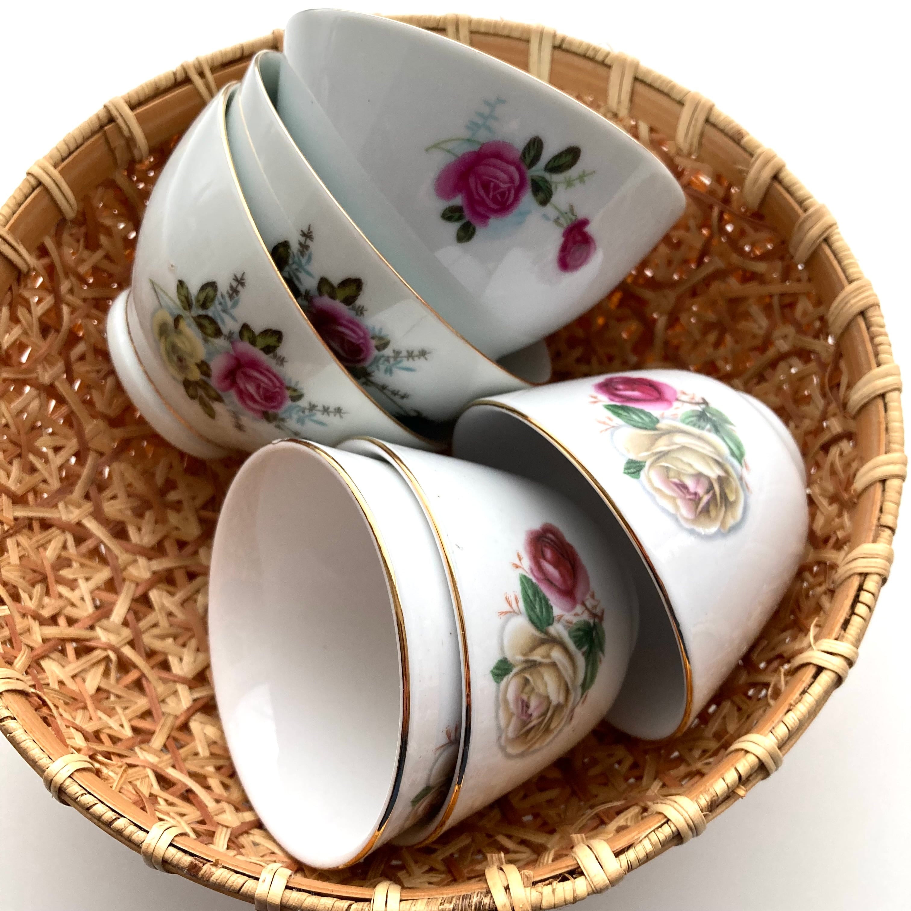 一部プリントが焼き付いている物も混じりますが、トリムの金彩ラインも綺麗で生地も薄く上質な状態を保っています。
