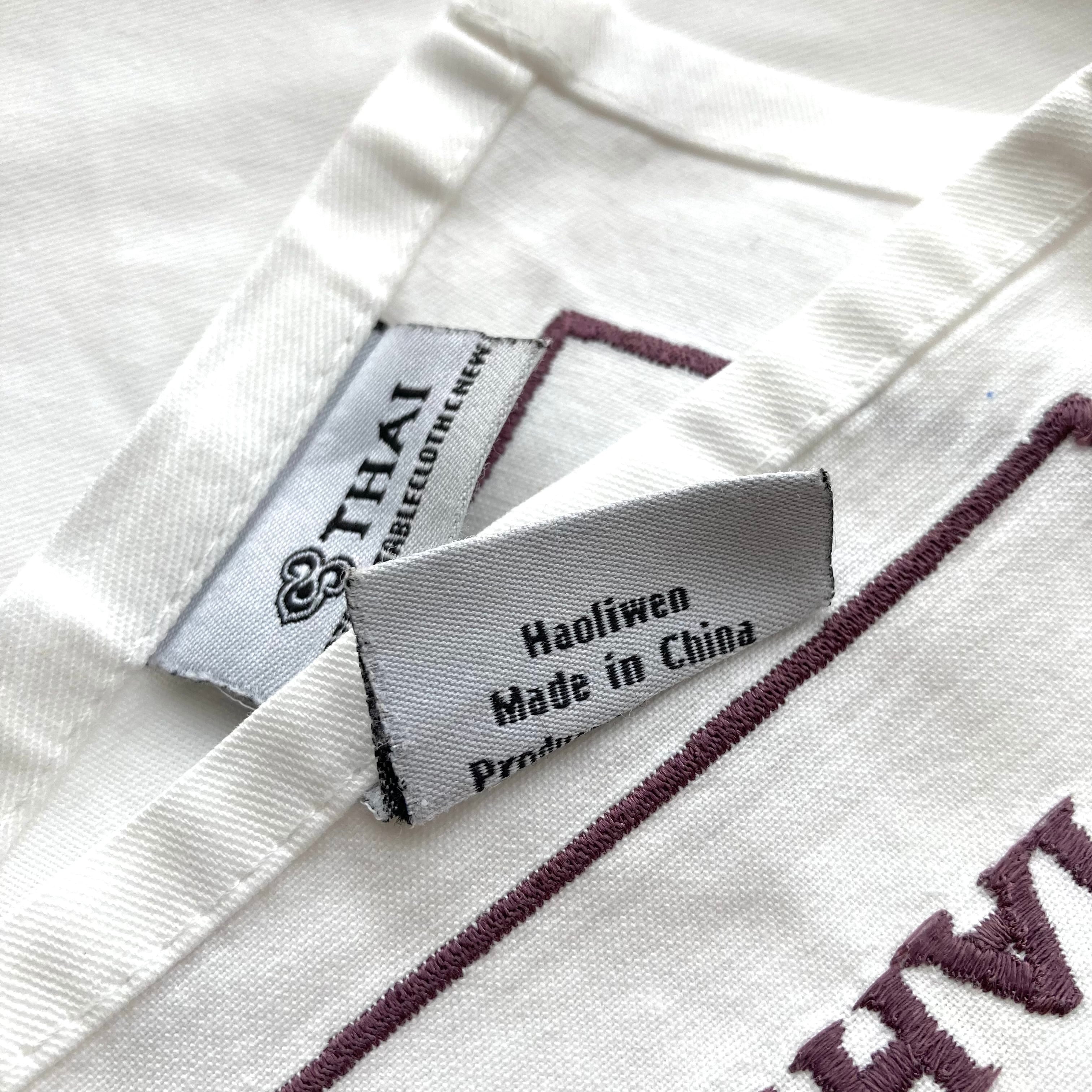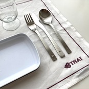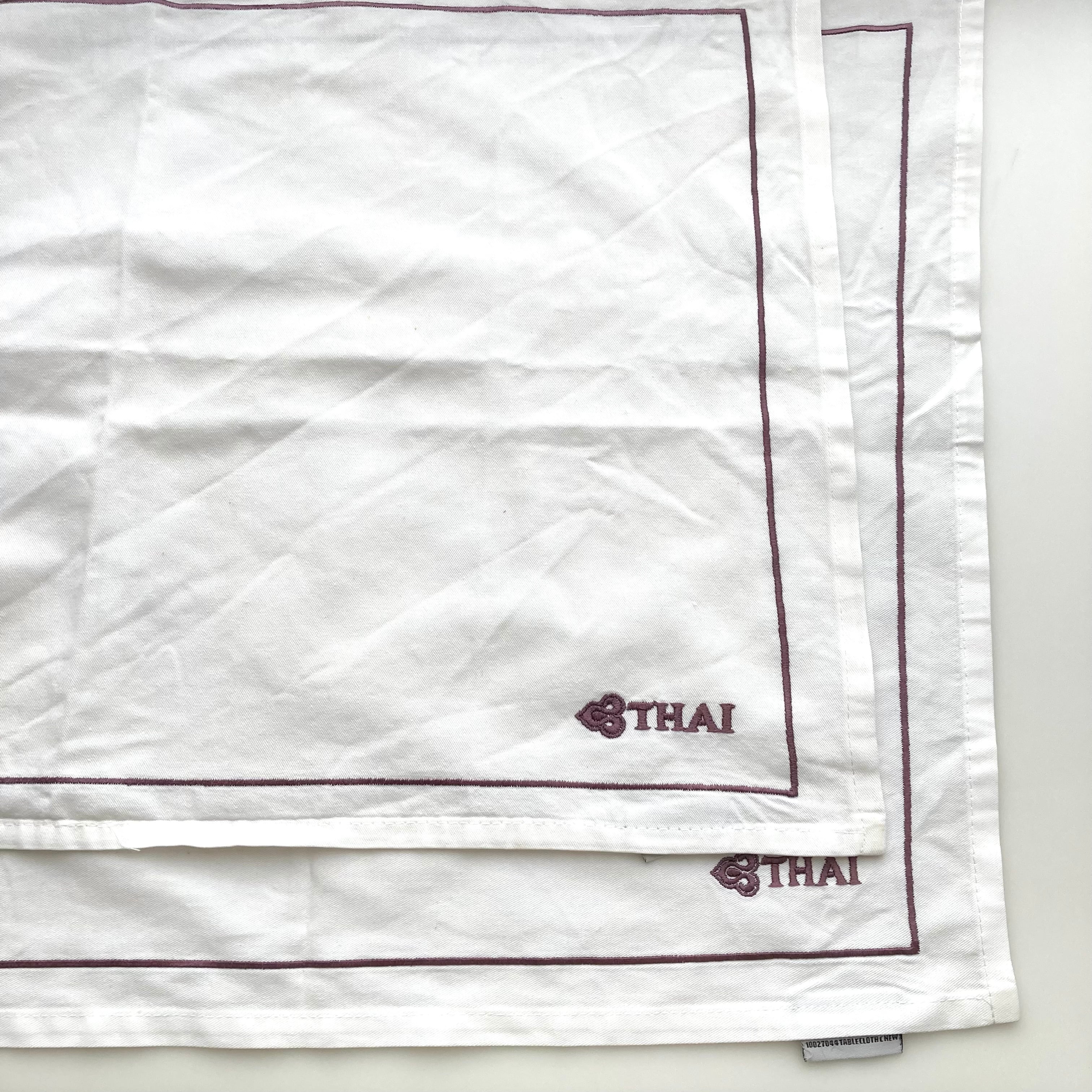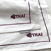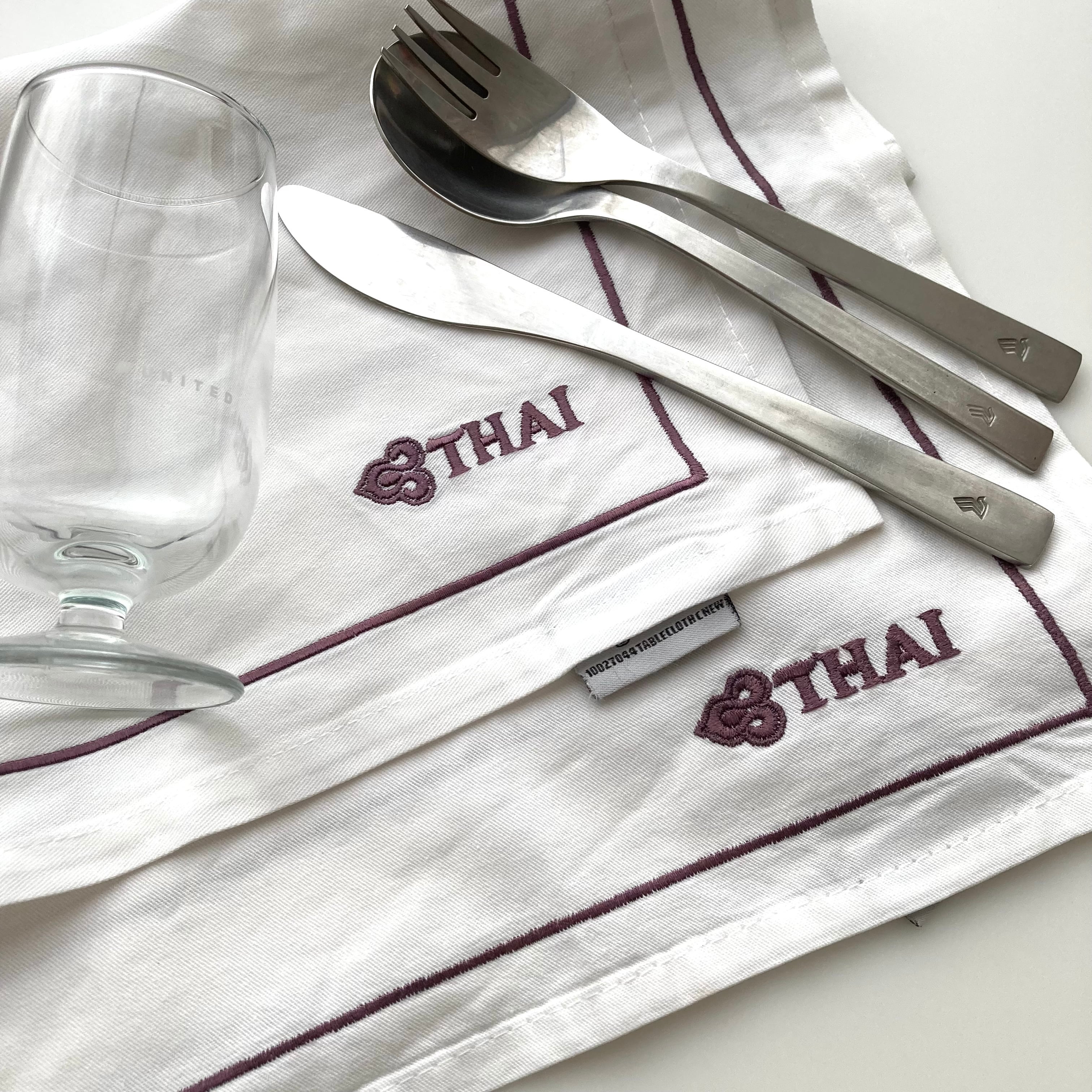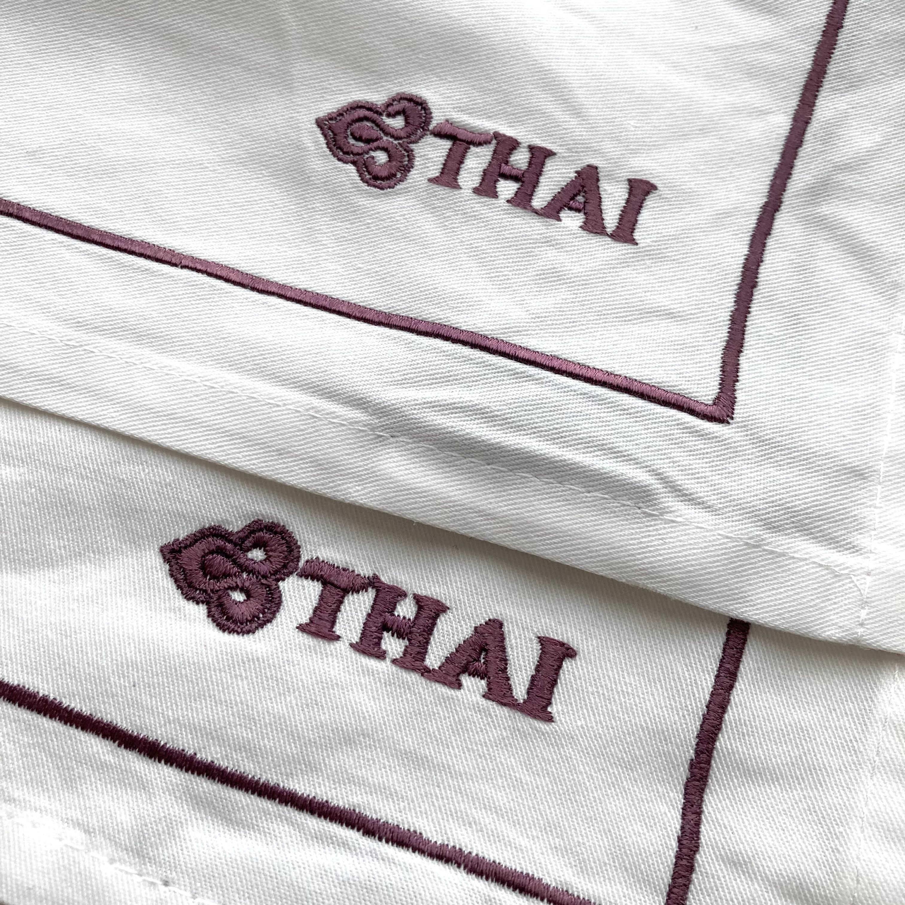 タイ国際航空の最新のCIロゴ「THAI」と料理が映える四角いフレームが刺繍されています。