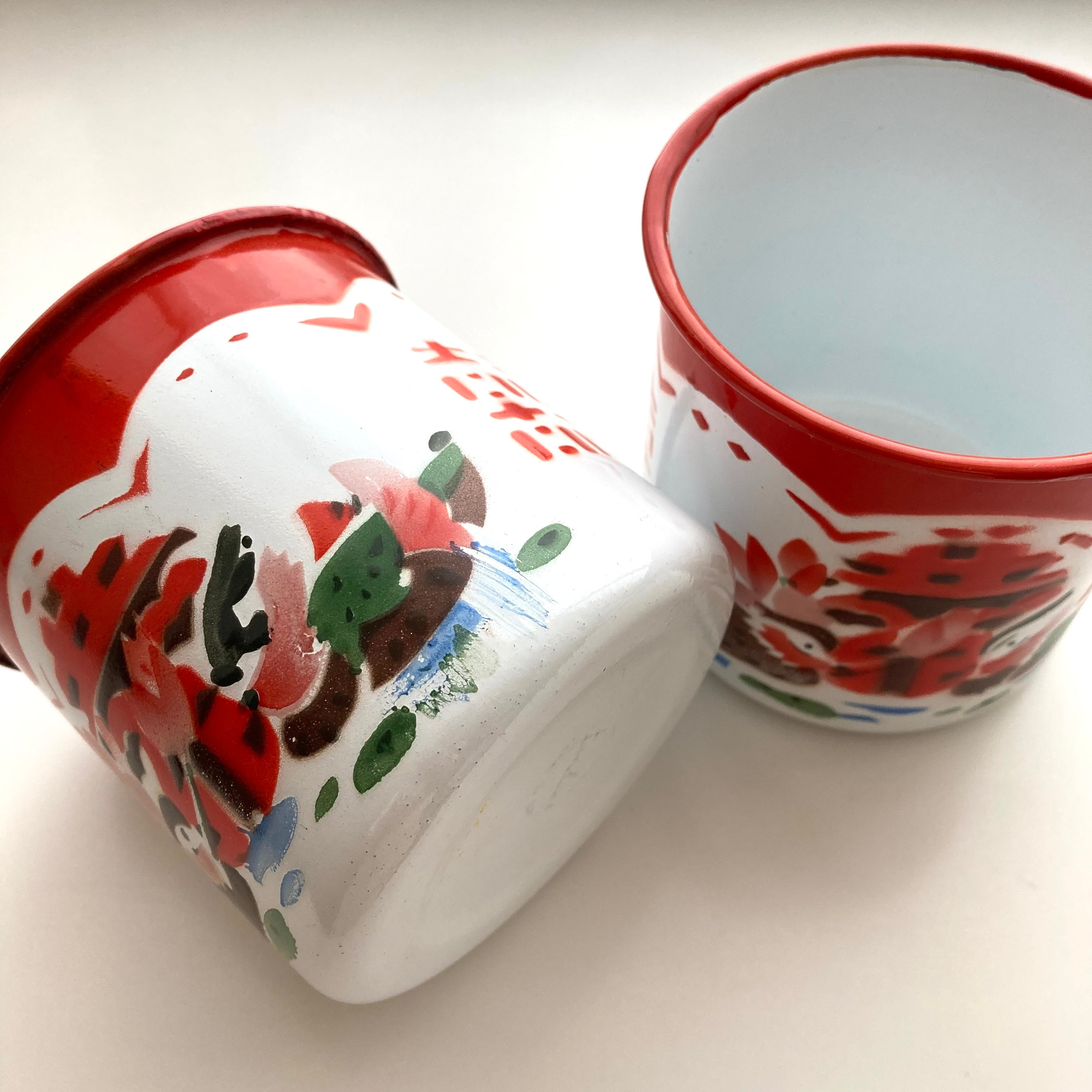 ステンシルベースのオシドリと双喜紋に一部厚塗りのハンドペイントがレトロな中国制造ホーローマグ。