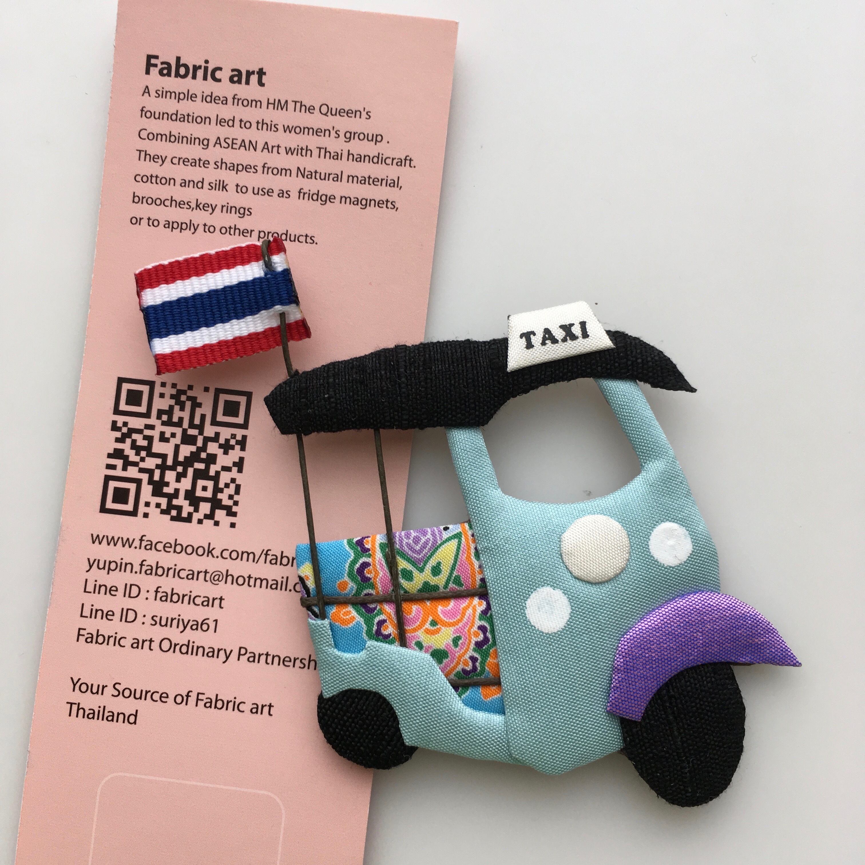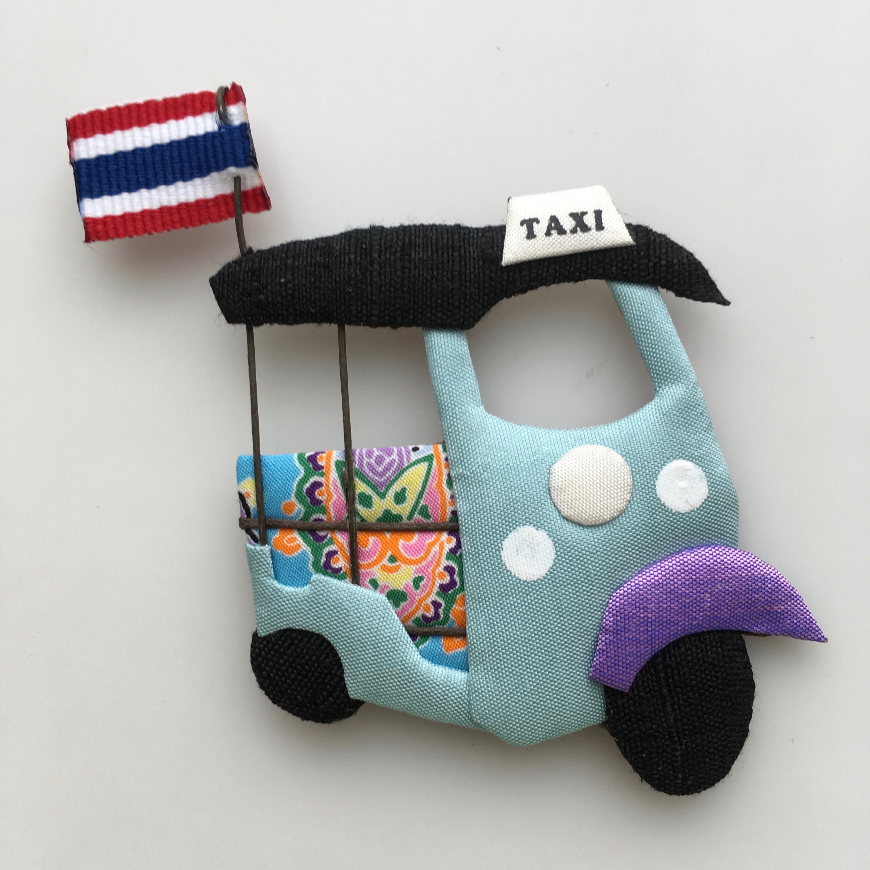 リサイクルシルクやコットン・紙など自然素材を貼り合わせて作り上げたバンコク名物「トゥクトゥク」のマグネットは、すべてハンドメイドの一点ものです。